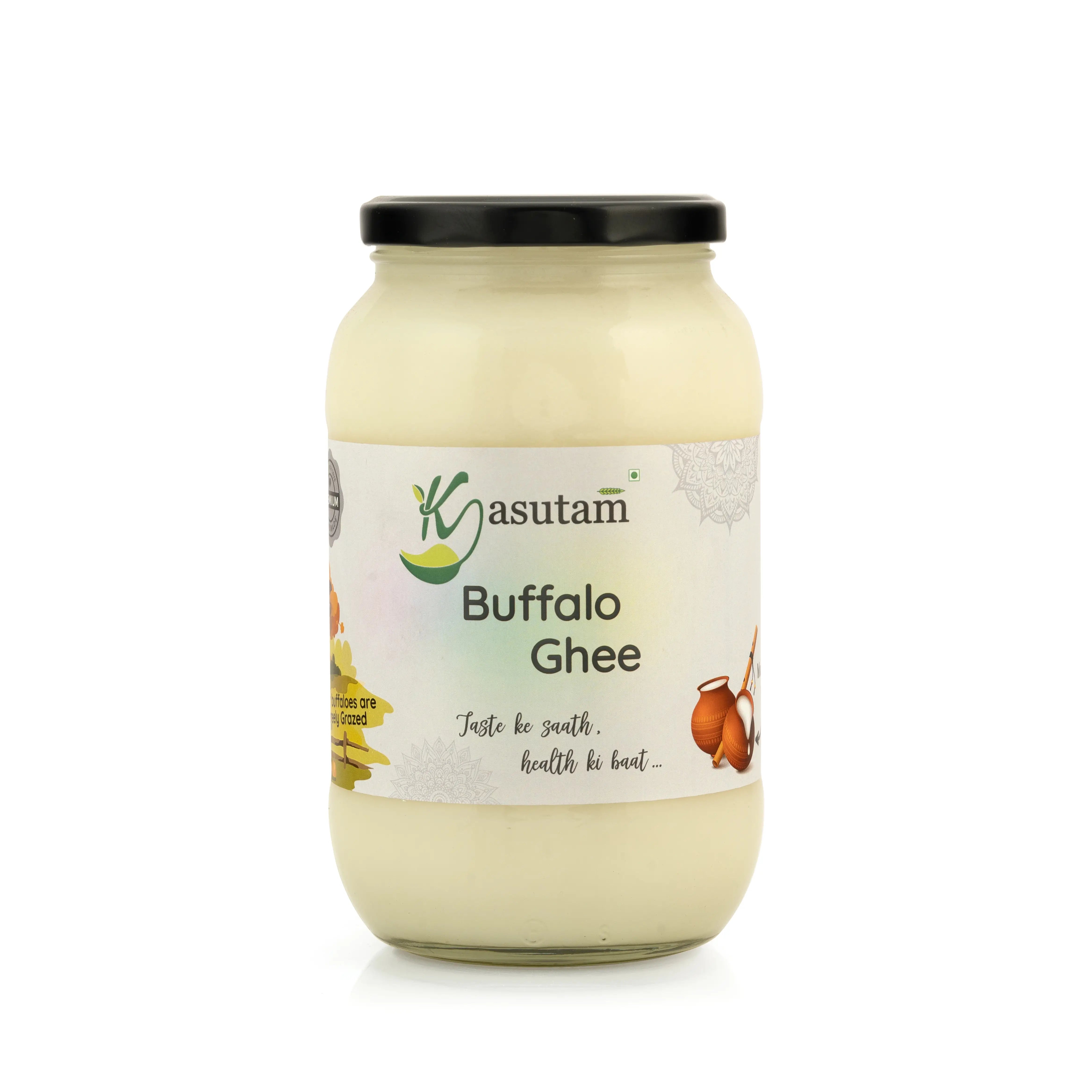 Kasutam Buffalo Ghee is made using the ancient Vedic method, where butter is churned from buttermilk and slow-heated on a desi chulha for a rich, creamy texture. Sourced from fresh farm buffalo milk, it’s handmade, preservative-free, and crafted with love.